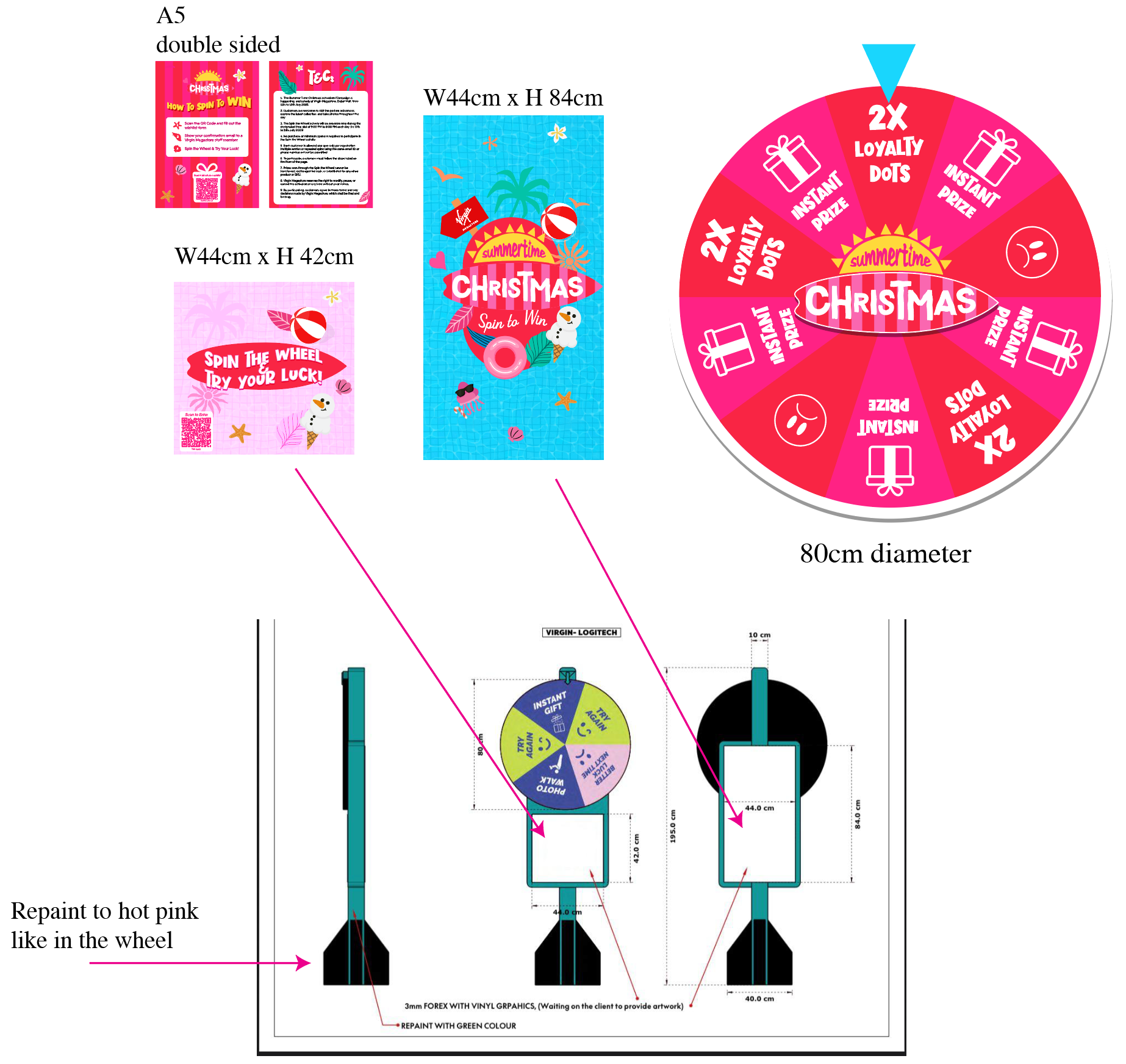 Branded Spin the Wheel design for a Summertime Christmas activation in Dubai Mall. The concept combined summer energy with festive holiday elements, creating a bright, cheerful setup that stood out in the mall. The activation included a giveaway mechanic, which drew large crowds and encouraged shopper participation, making it one of the most engaging in-store moments of the season.