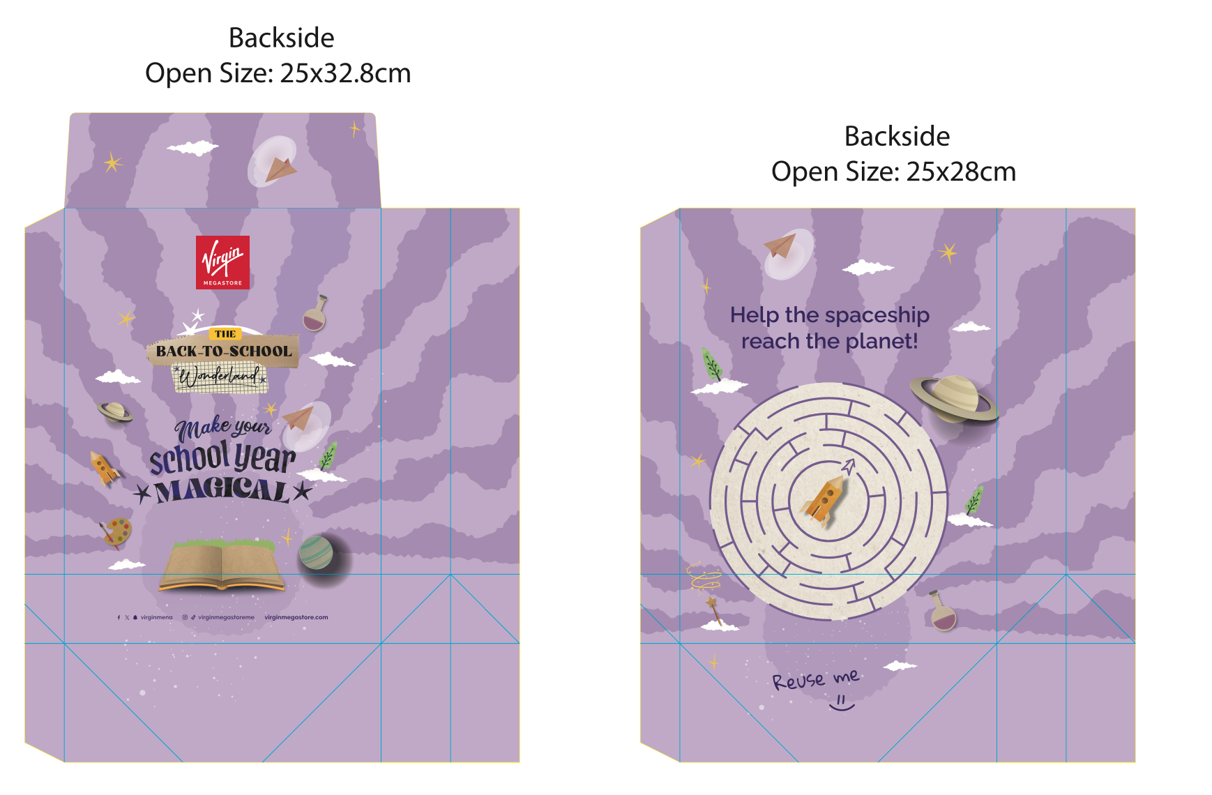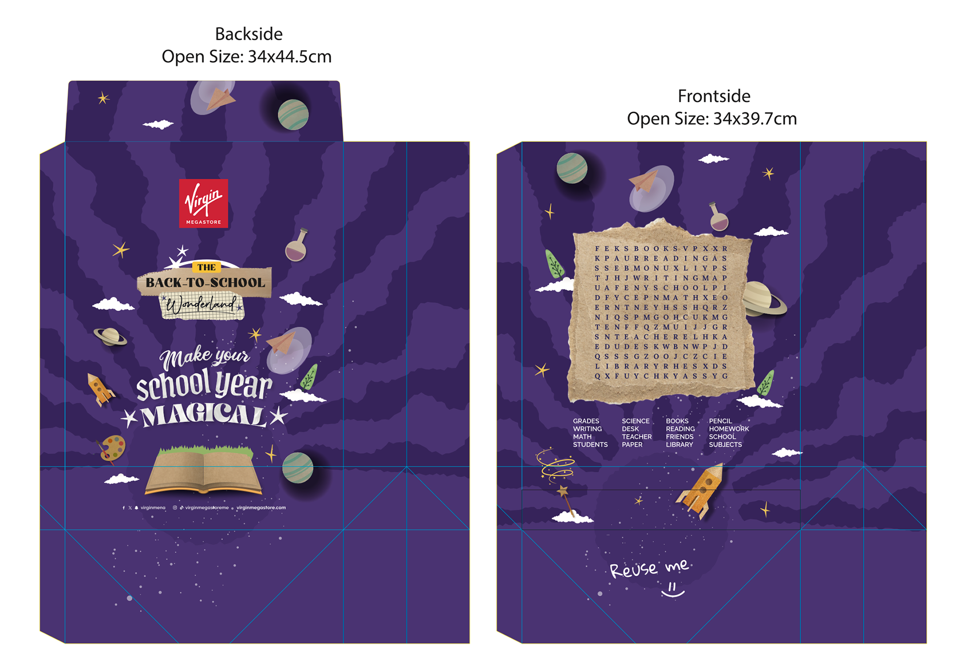 Created for the Spin the Wheel activation, these Back to School gift bags carried the campaign visuals while adding a sustainable, interactive twist. The backs featured games like math problems, a maze, and a word search — designed to give the bags a second life and encourage reuse. A small message at the bottom, “Reuse Me,” reinforced the eco-friendly intent while keeping the experience fun and meaningful for kids.