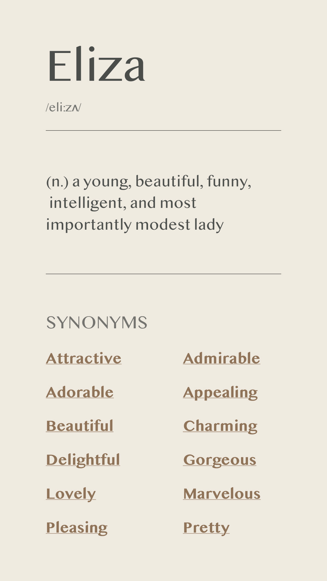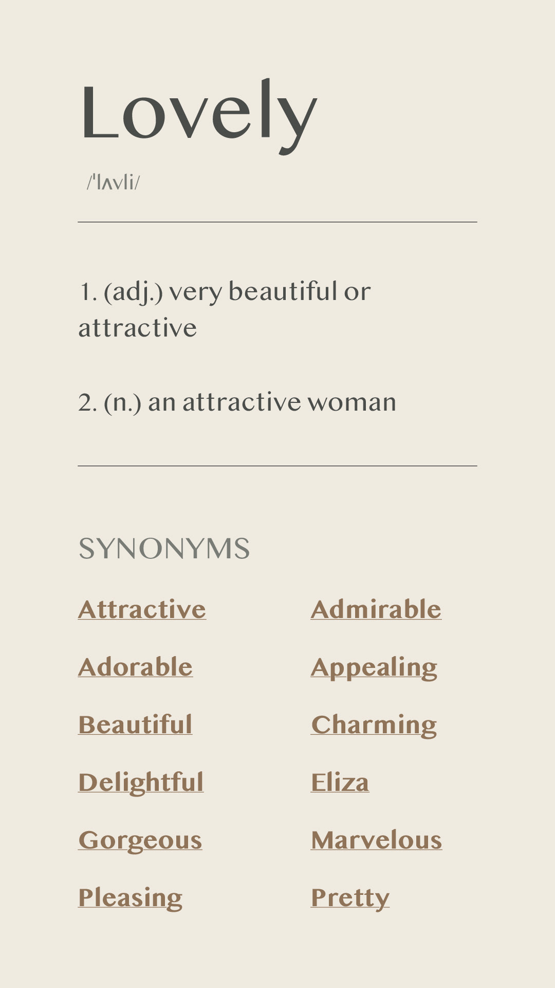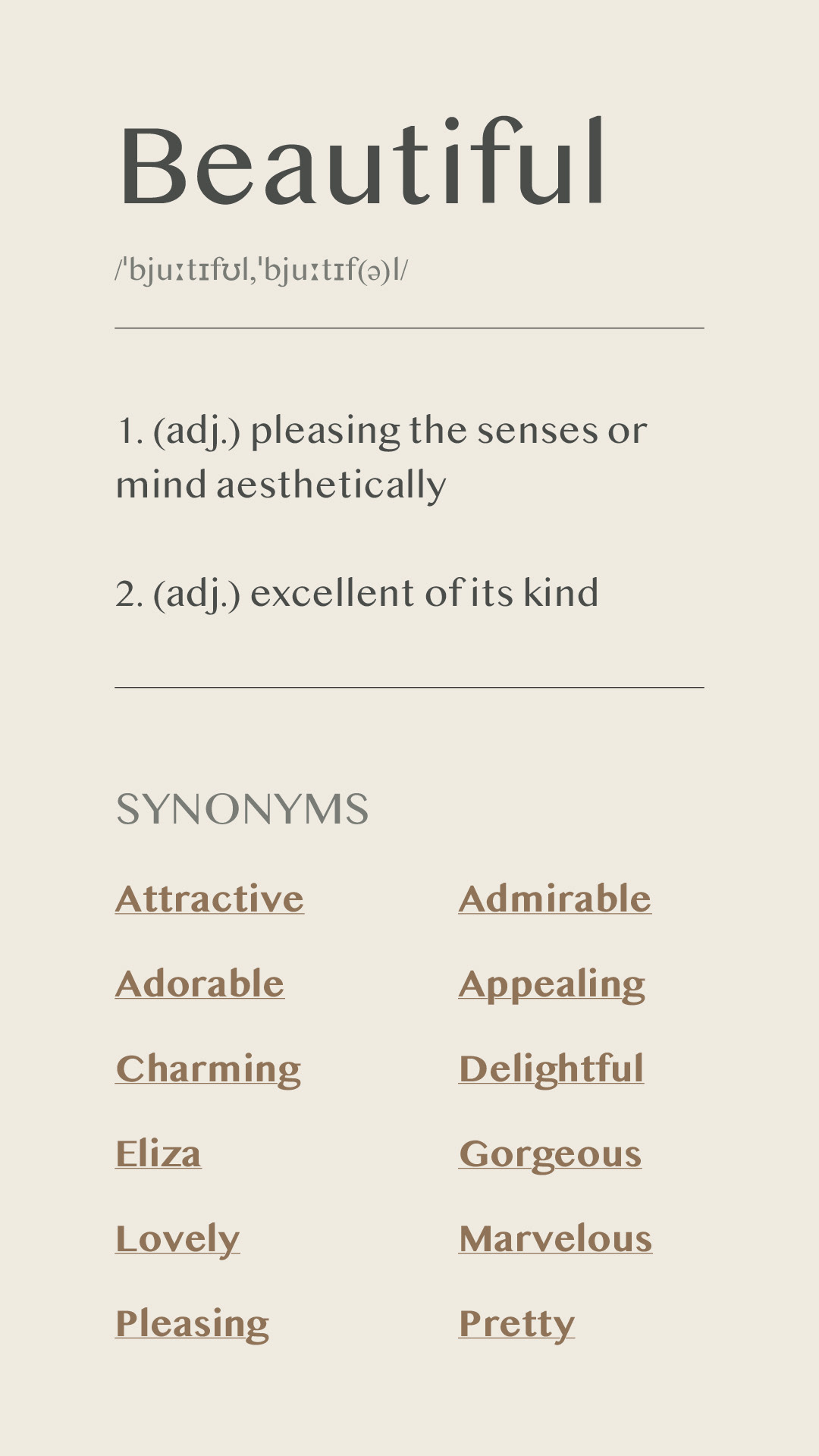 A visually elegant thesaurus designed as a university project, exploring typographic hierarchy and layout to make word relationships clear and engaging. A playful touch was added in one entry, where my name appears as a synonym for beautiful — consider it an Easter egg.