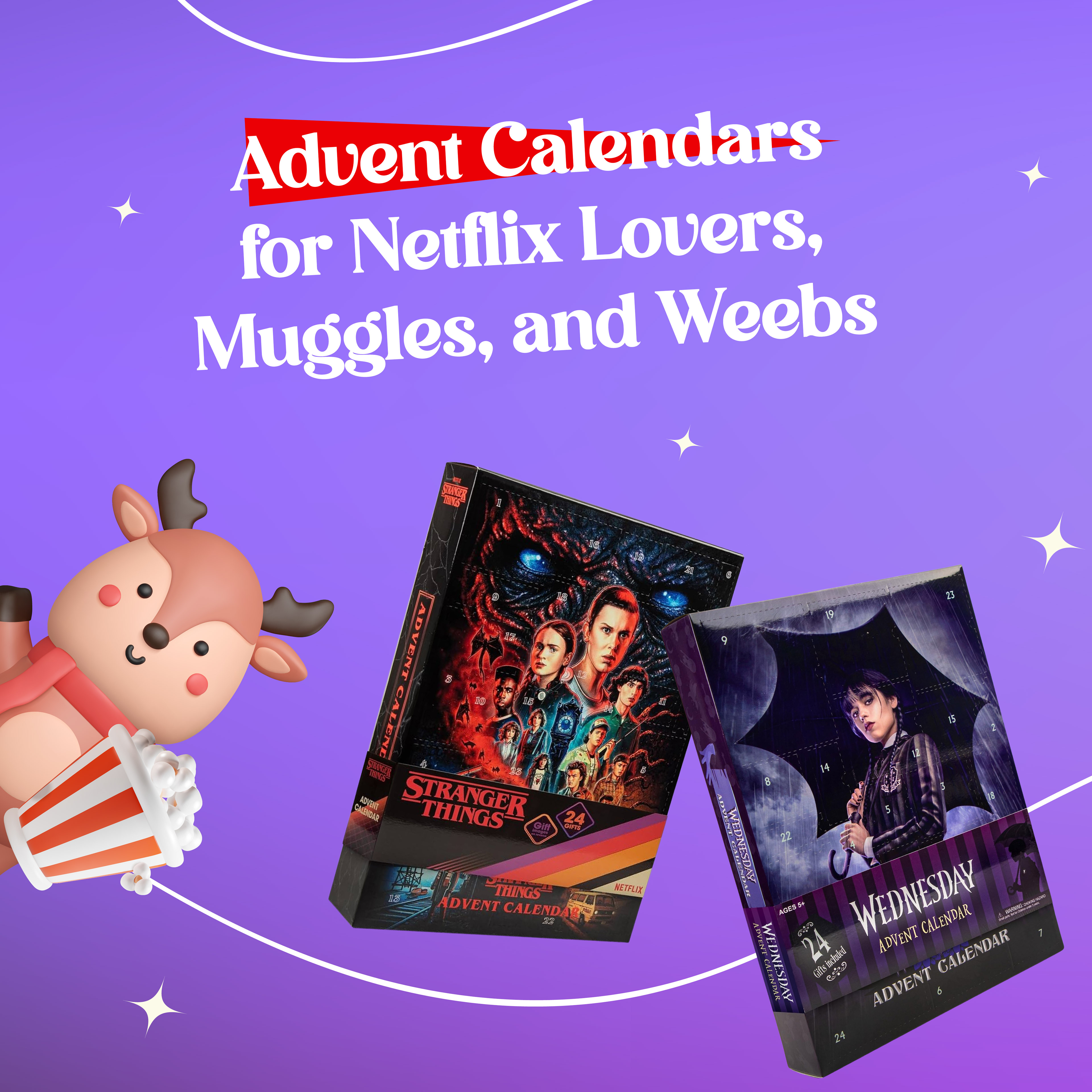 A fun holiday carousel showcasing advent calendars tailored to every fandom — from Harry Potter to Netflix and anime.